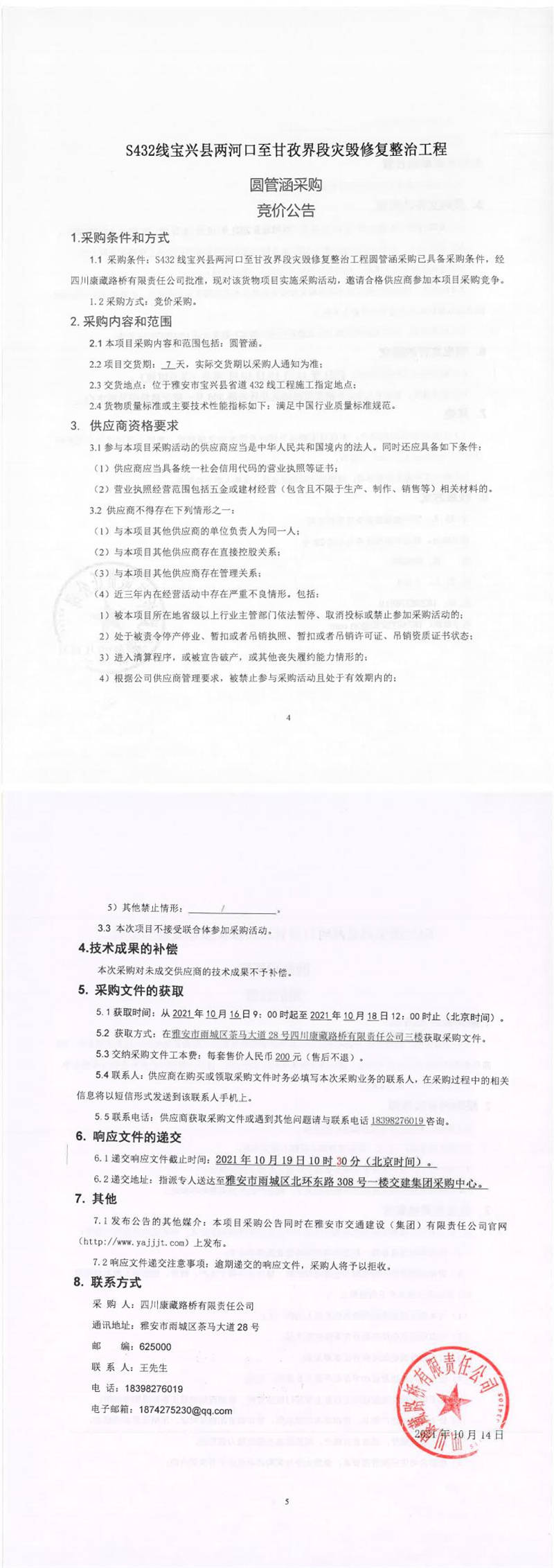 四川康藏路橋有限責任公司S432線寶興縣兩河口至甘孜界段災(zāi)毀修復(fù)整治工程圓管涵采購競價公告