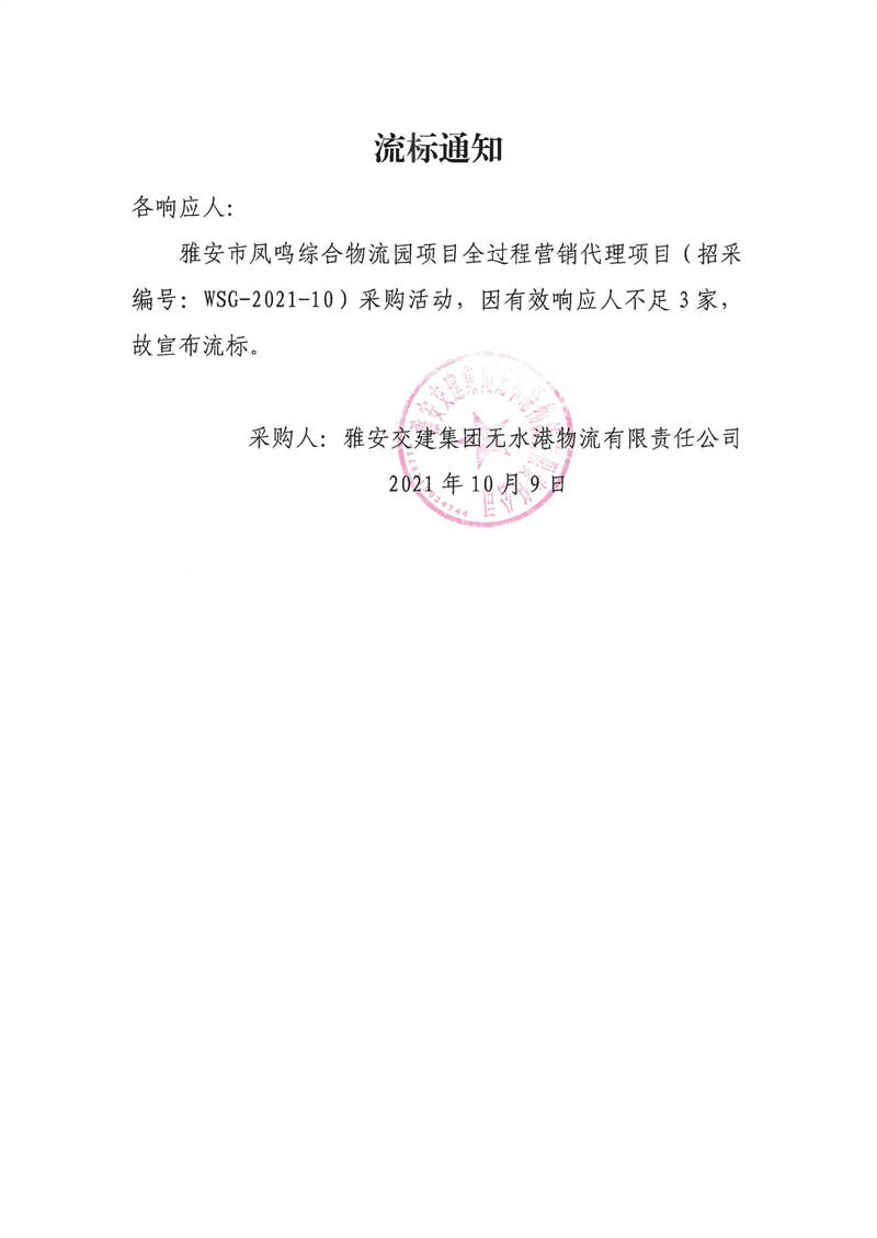 雅安交建集團(tuán)無水港物流有限責(zé)任公司雅安市鳳鳴綜合物流園項(xiàng)目全過程營(yíng)銷代理項(xiàng)目流標(biāo)通知