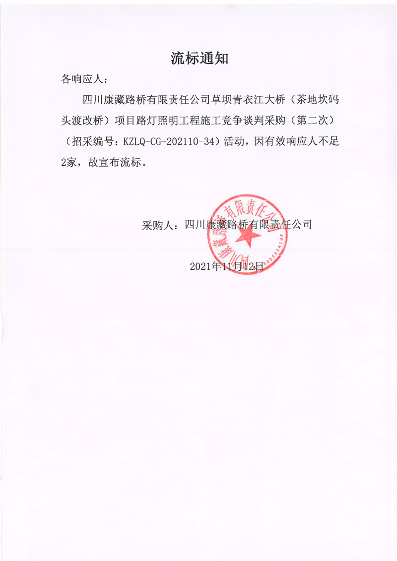 四川康藏路橋有限責(zé)任公司草壩青衣江大橋(茶地坎碼頭渡改橋)項目路燈照明工程施工競爭談判采購(第二次)流標通知
