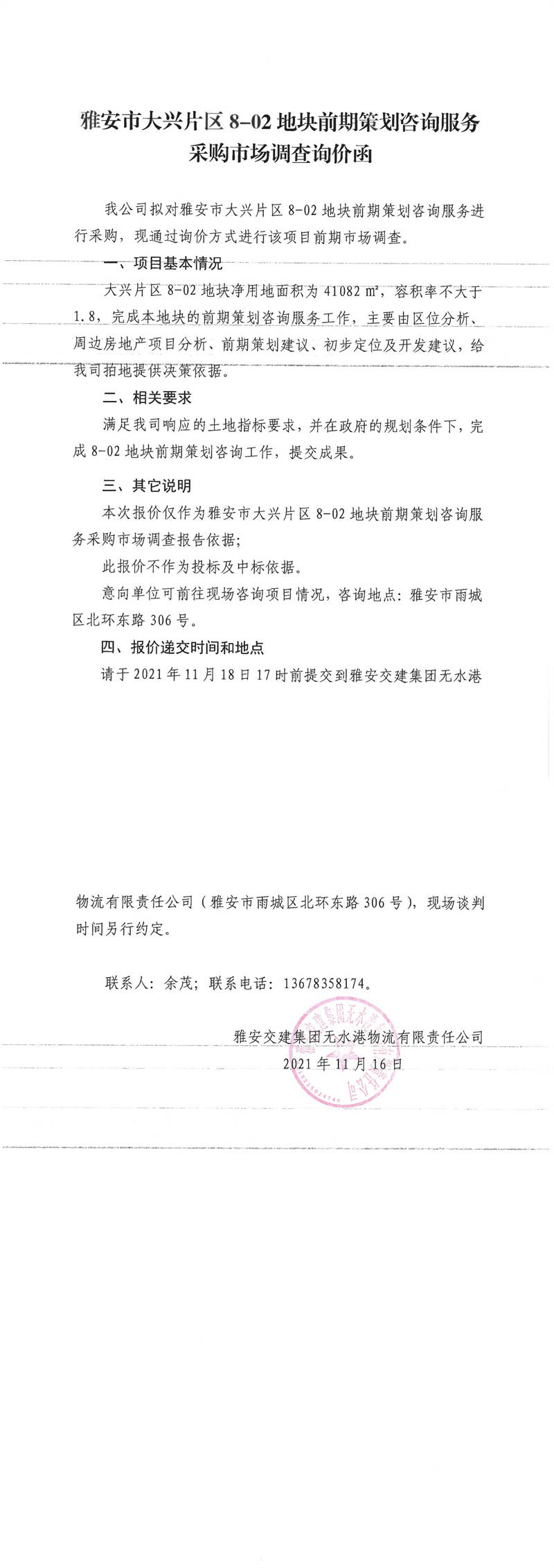 雅安交建集團無水港物流有限責(zé)任公司雅安市大興片區(qū)8-02地塊前期策劃咨詢服務(wù)采購市場調(diào)查詢價函