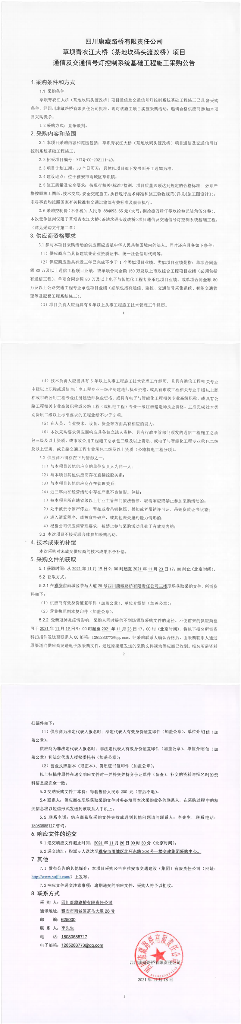 四川康藏路橋有限責(zé)任公司草壩青衣江大橋(茶地坎碼頭渡改橋)項(xiàng)目通信及交通信號(hào)燈控制系統(tǒng)基礎(chǔ)工程施工采購(gòu)公告