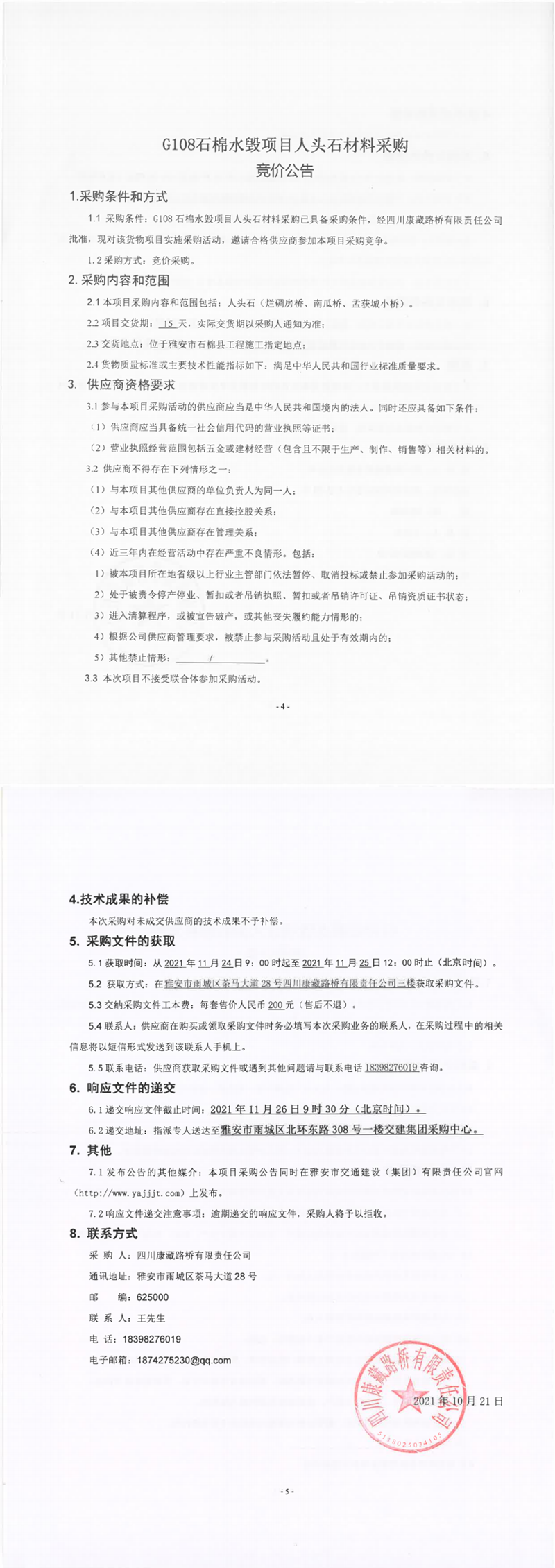 四川康藏路橋有限責(zé)任公司G108石棉水毀項(xiàng)目人頭石材料采購競價公告