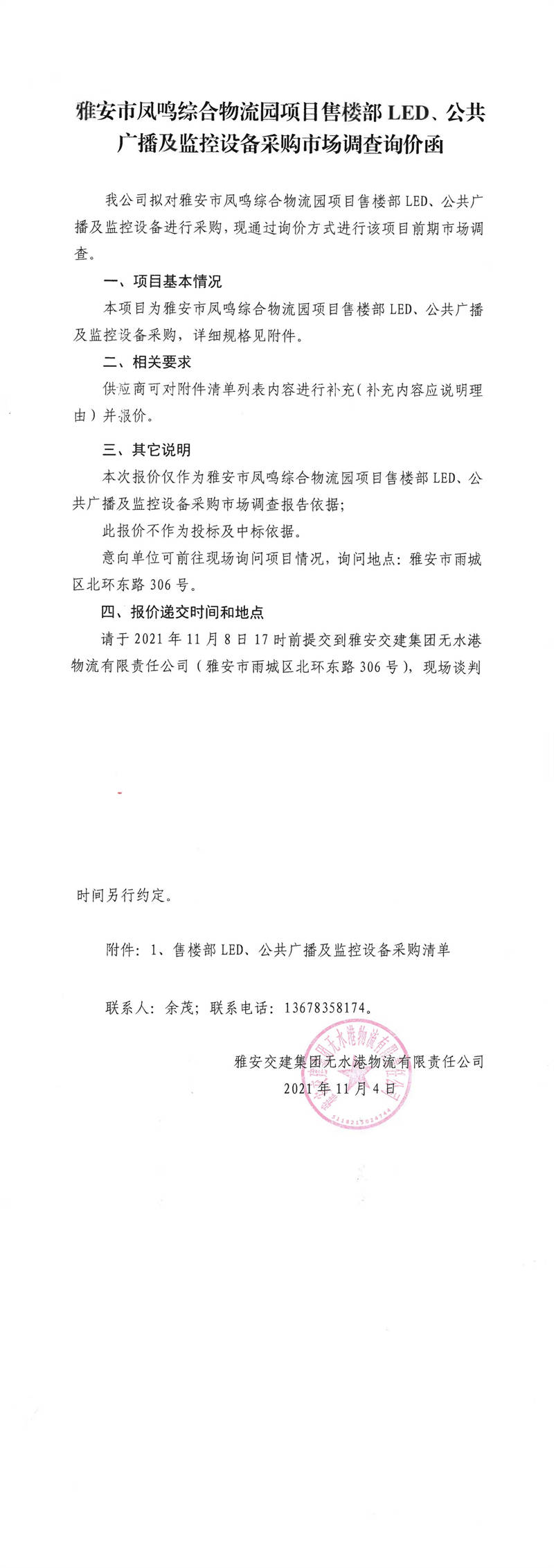 雅安交建集團(tuán)無水港物流有限責(zé)任公司雅安市鳳鳴綜合物流園項(xiàng)目售樓部LED、公共廣播及監(jiān)控設(shè)備采購市場(chǎng)調(diào)查詢價(jià)函