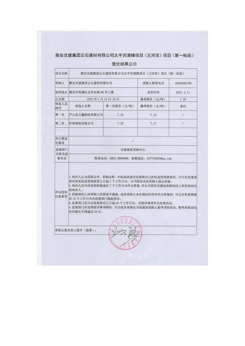 雅安交建集團(tuán)云石建材有限公司太平河清障項(xiàng)目(王河壩)項(xiàng)目(第一標(biāo)段)競價結(jié)果公示