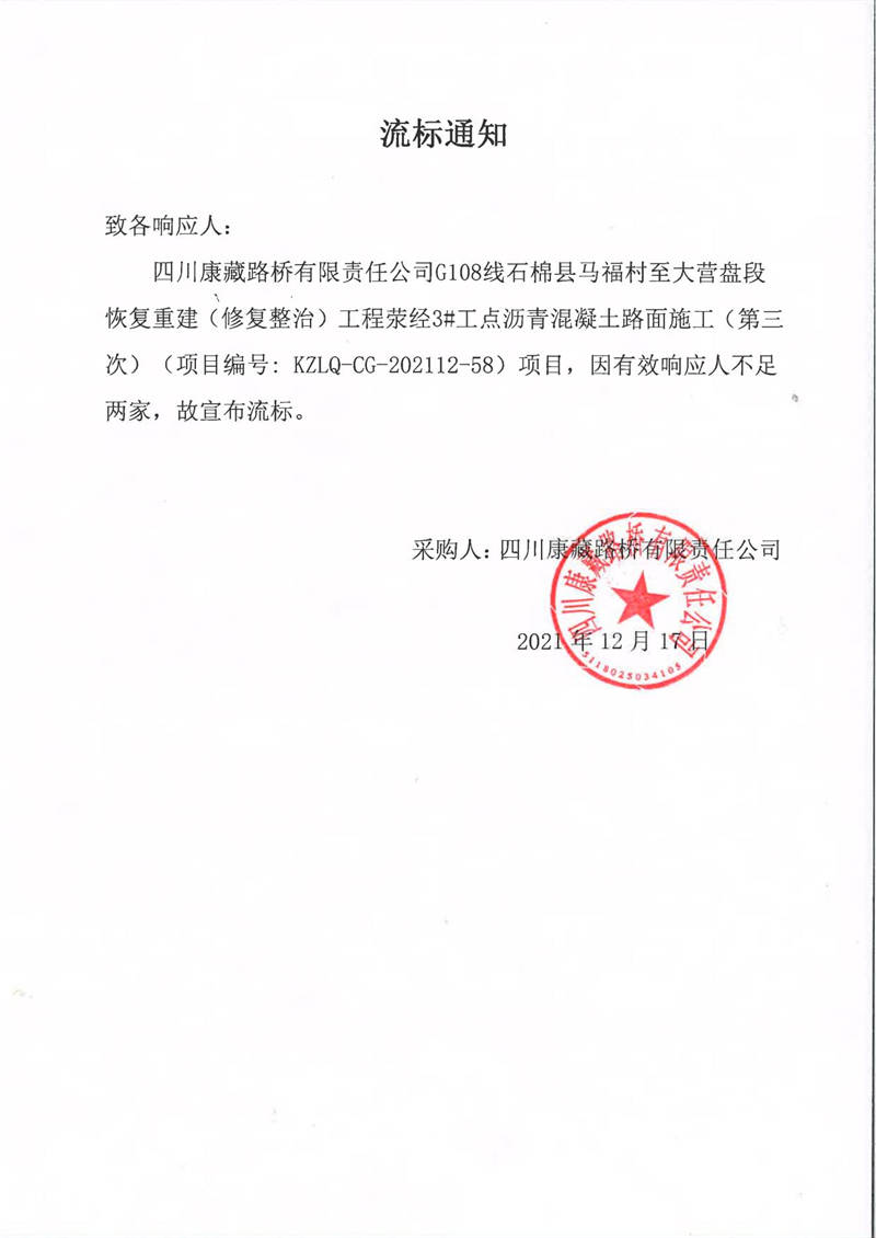 四川康藏路橋有限責(zé)任公司G108線石棉縣馬福村至大營盤段恢復(fù)重建(修復(fù)整治)工程滎經(jīng)3#工點瀝青混凝土路面施工(第三次)流標通知