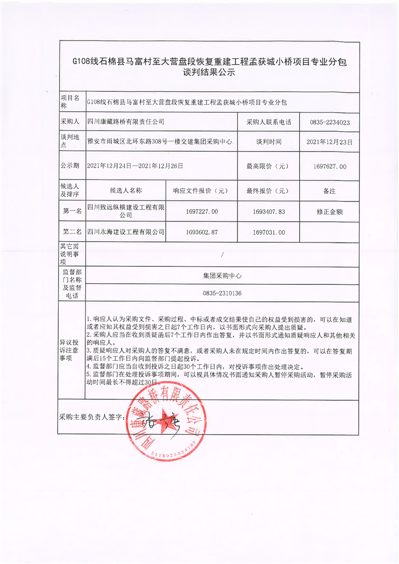 四川康藏路橋有限責任公司G108線石棉縣馬富村至大營盤段恢復重建工程孟獲城小橋項目專業(yè)分包談判結果公示