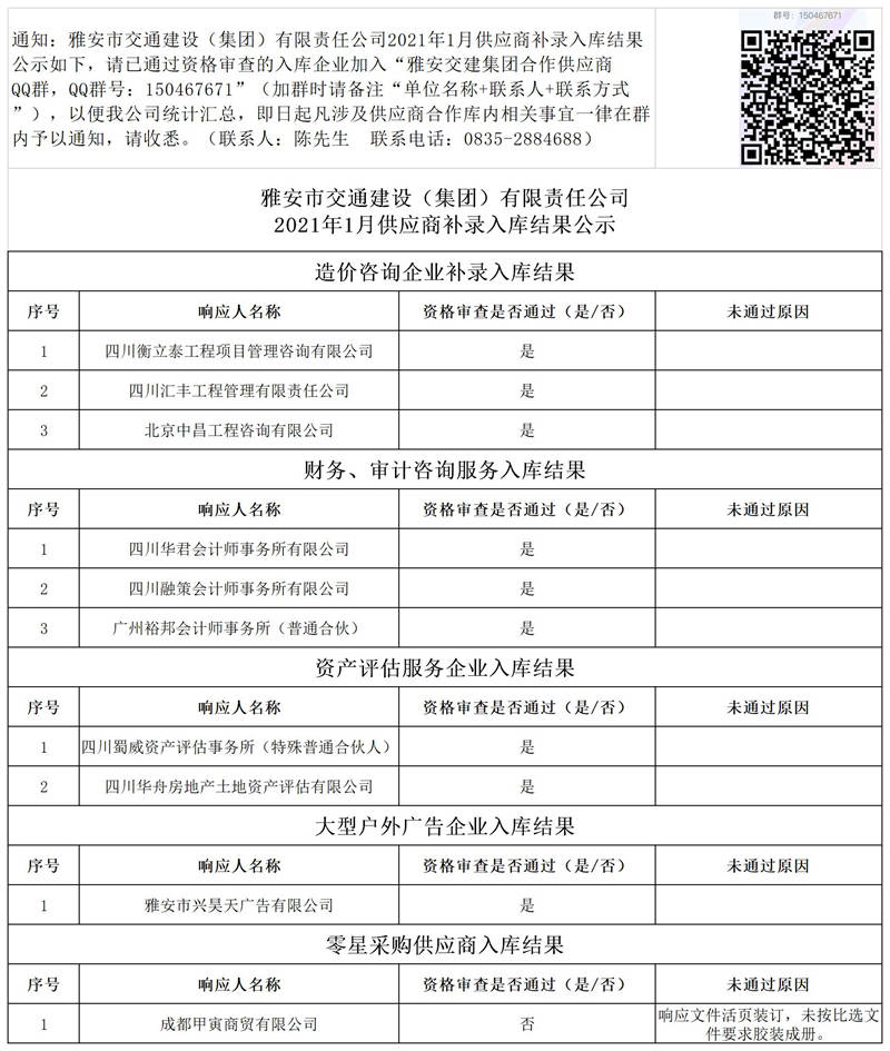 雅安市交通建設(shè)(集團)有限責(zé)任公司2021年1月供應(yīng)商補錄入庫結(jié)果公示