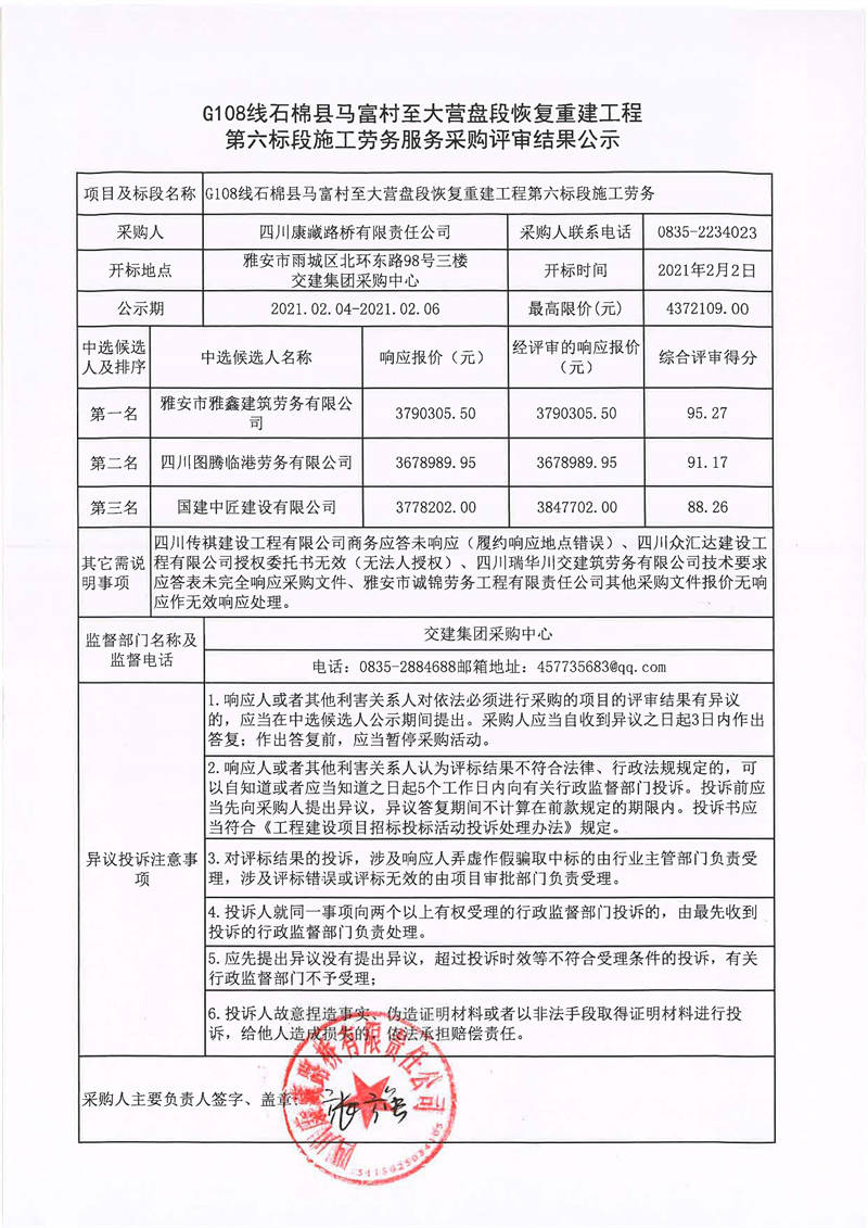 四川康藏路橋有限責(zé)任公司G108線石棉縣馬富村至大營盤段恢復(fù)重建工程第六標段施工勞務(wù)服務(wù)采購評審結(jié)果公示