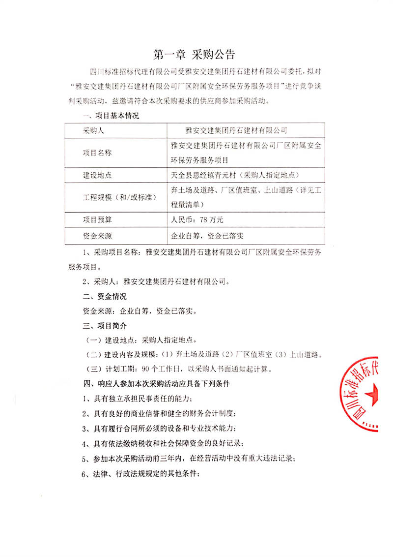 雅安交建集團丹石建材有限公司廠區(qū)附屬安全環(huán)保勞務服務項目競爭談判公告