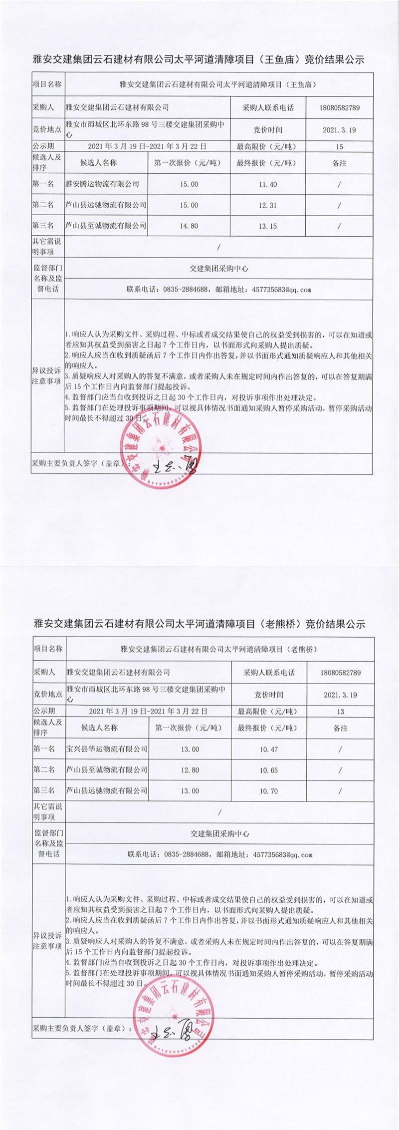 雅安交建集團云石建材有限公司太平河道清障項目競價結(jié)果公示