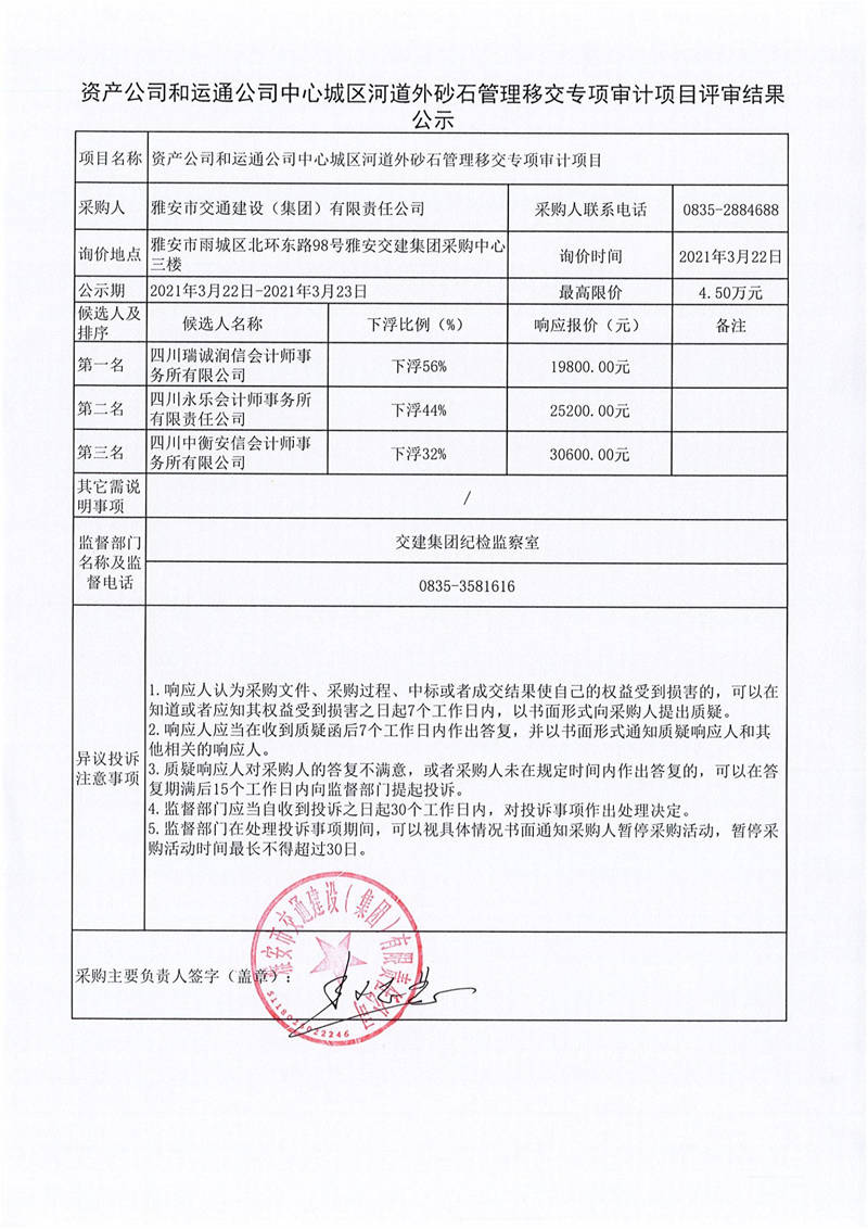 雅安市交通建設(集團)有限責任公司資產公司和運通公司中心城區(qū)河道外砂石管理移交專項審計項目評審結果公示