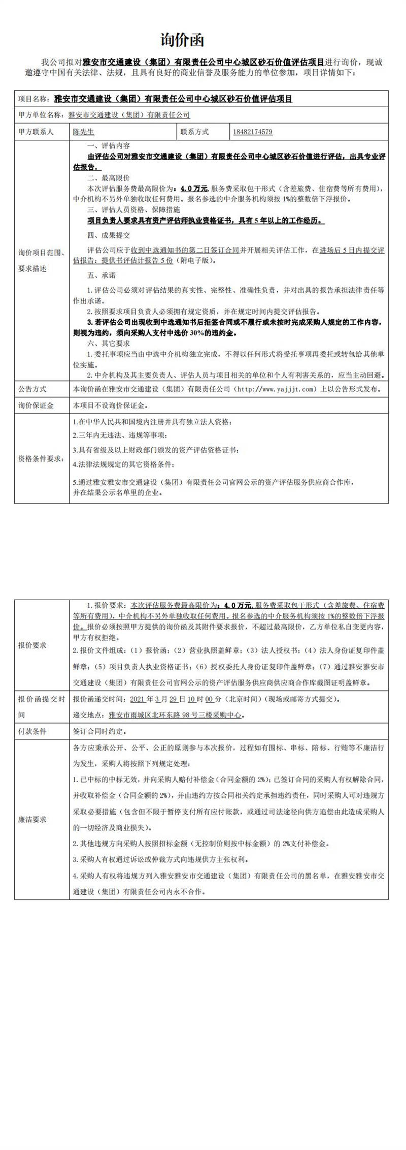 雅安市交通建設(shè)(集團(tuán))有限責(zé)任公司中心城區(qū)砂石價值評估項(xiàng)目詢價函