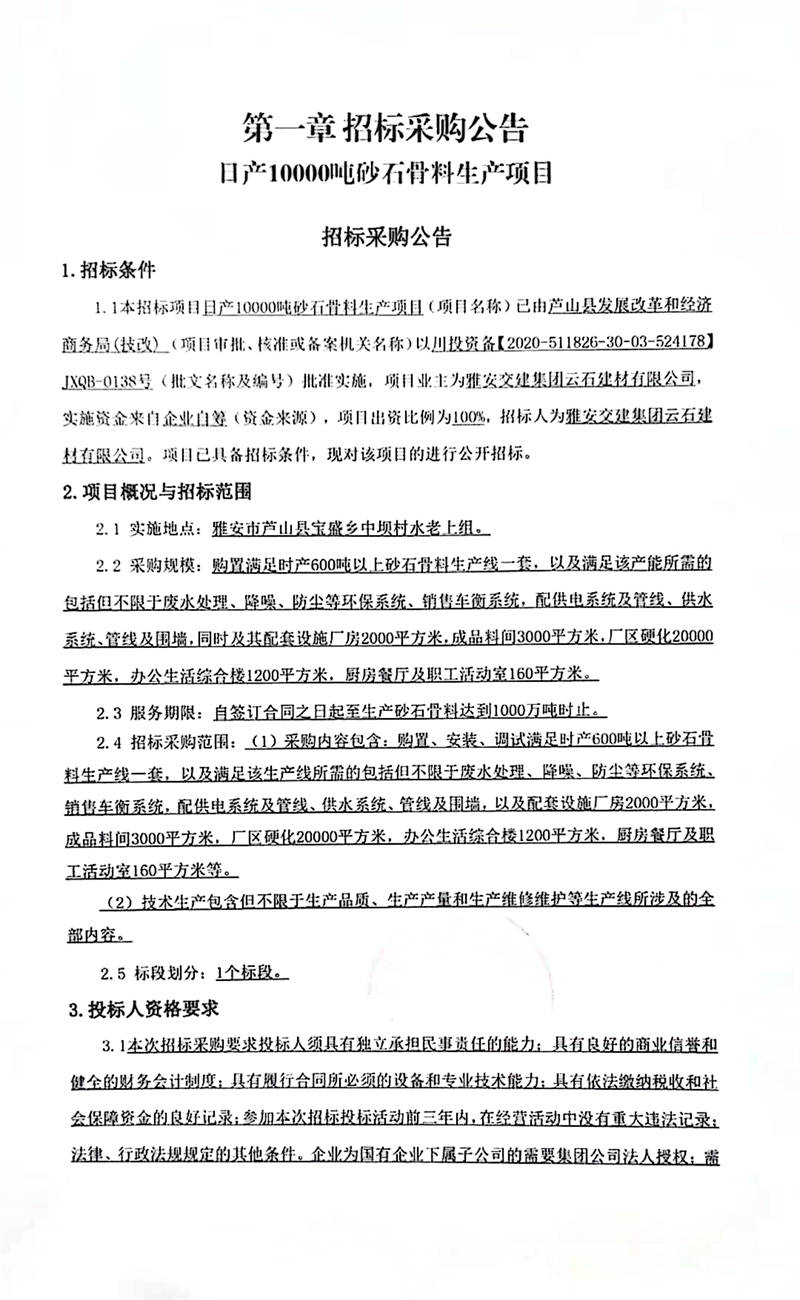 雅安交建集團(tuán)云石建材有限公司日產(chǎn)10000噸砂石骨料生產(chǎn)項目招標(biāo)采購公告