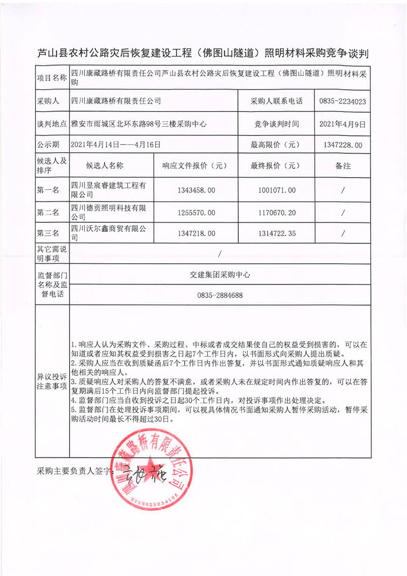 四川康藏路橋有限責(zé)任公司蘆山縣農(nóng)村公路災(zāi)后恢復(fù)建設(shè)工程(佛圖山隧道)照明材料采購競(jìng)爭(zhēng)談判結(jié)果公示