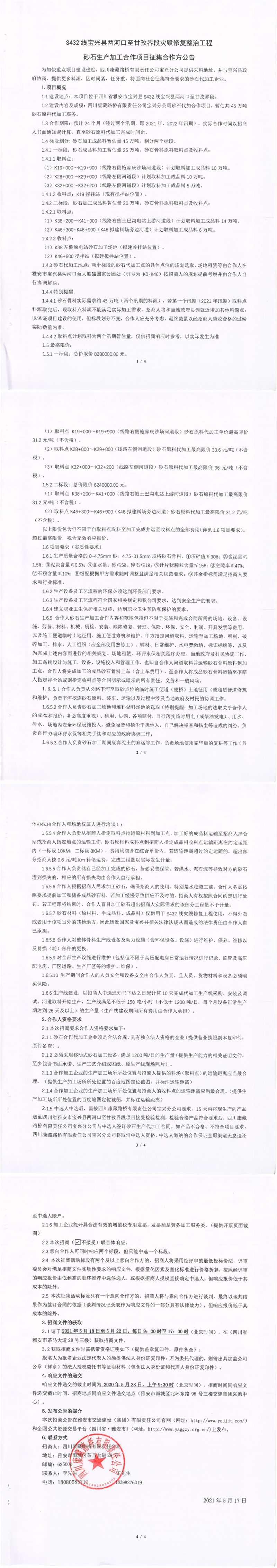 四川康藏路橋有限責任公司S432線寶興縣兩河口至甘孜界段災毀修復整治工程砂石生產(chǎn)加工合作項目征集合作方公告