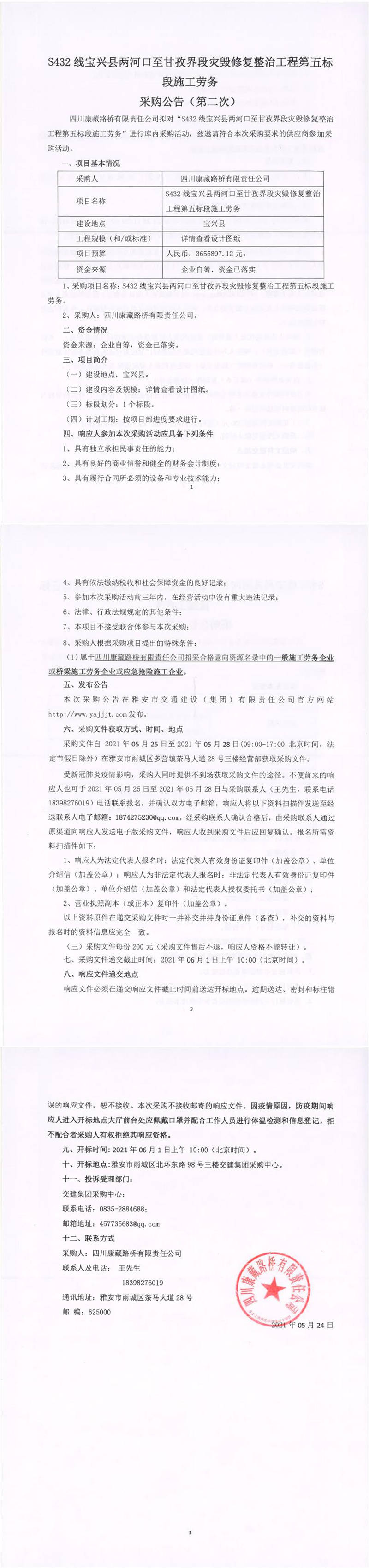 四川康藏路橋有限責(zé)任公司S432線寶興縣兩河口至甘孜界段災(zāi)毀修復(fù)整治工程第五標(biāo)段施工勞務(wù)采購公告(第二次)