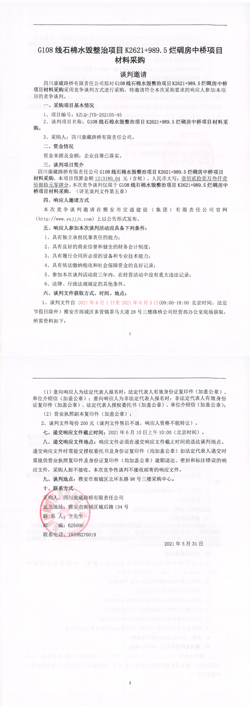 四川康藏路橋有限責(zé)任公司G108線石棉水毀整治項(xiàng)目K2621+989.5爛碉房中橋項(xiàng)目材料采購(gòu)競(jìng)爭(zhēng)談判公告