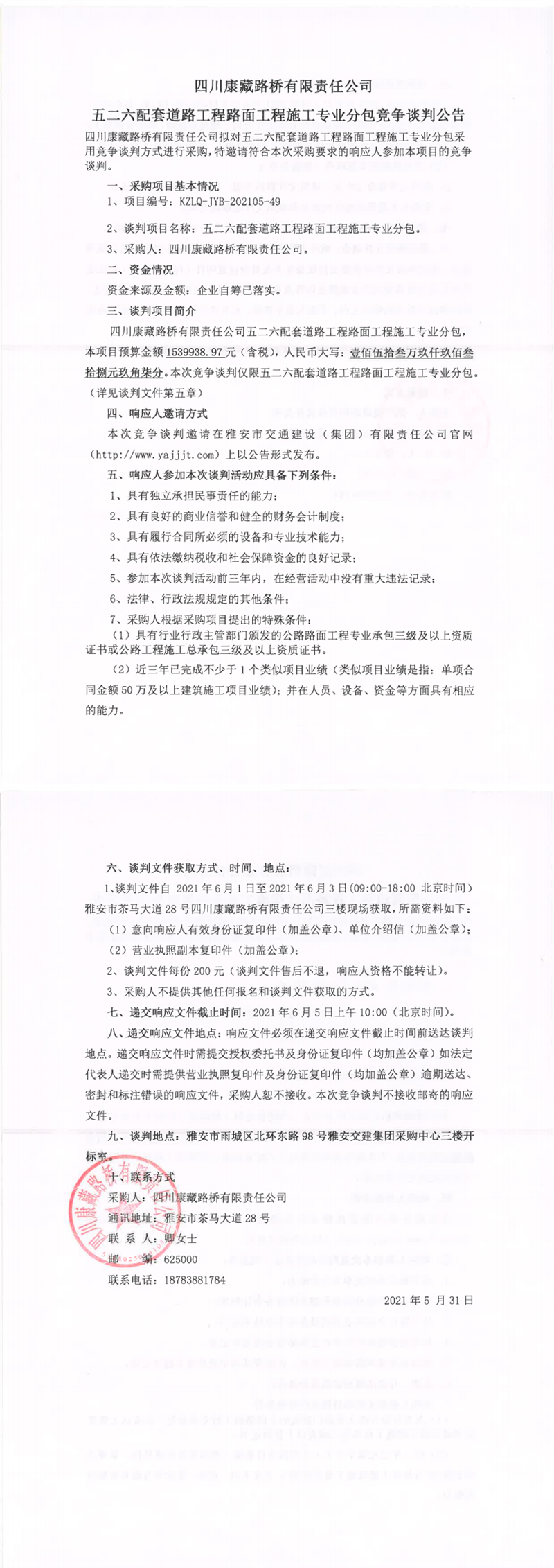 四川康藏路橋有限責(zé)任公司五二六配套道路工程路面工程施工專業(yè)分包競爭談判公告