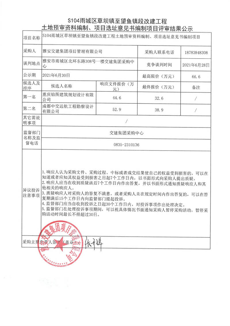 雅安交建集團(tuán)項目管理有限公司S104雨城區(qū)草壩鎮(zhèn)至望魚鎮(zhèn)段改建工程土地預(yù)審資料編制、項目選址意見書編制項目評審結(jié)果公示