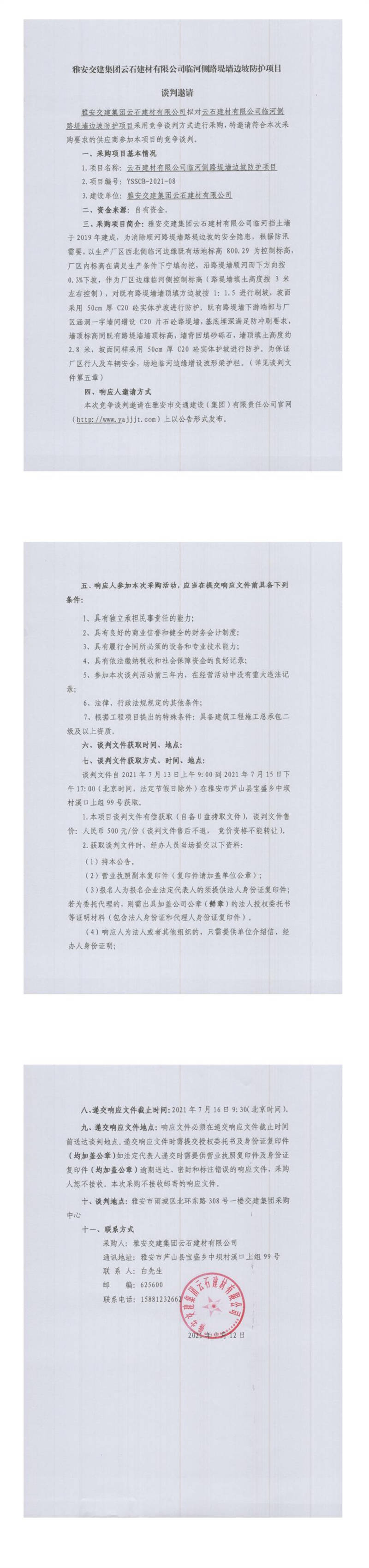雅安交建集團(tuán)云石建材有限公司臨河側(cè)路堤墻邊坡防護(hù)項目競爭談判公告