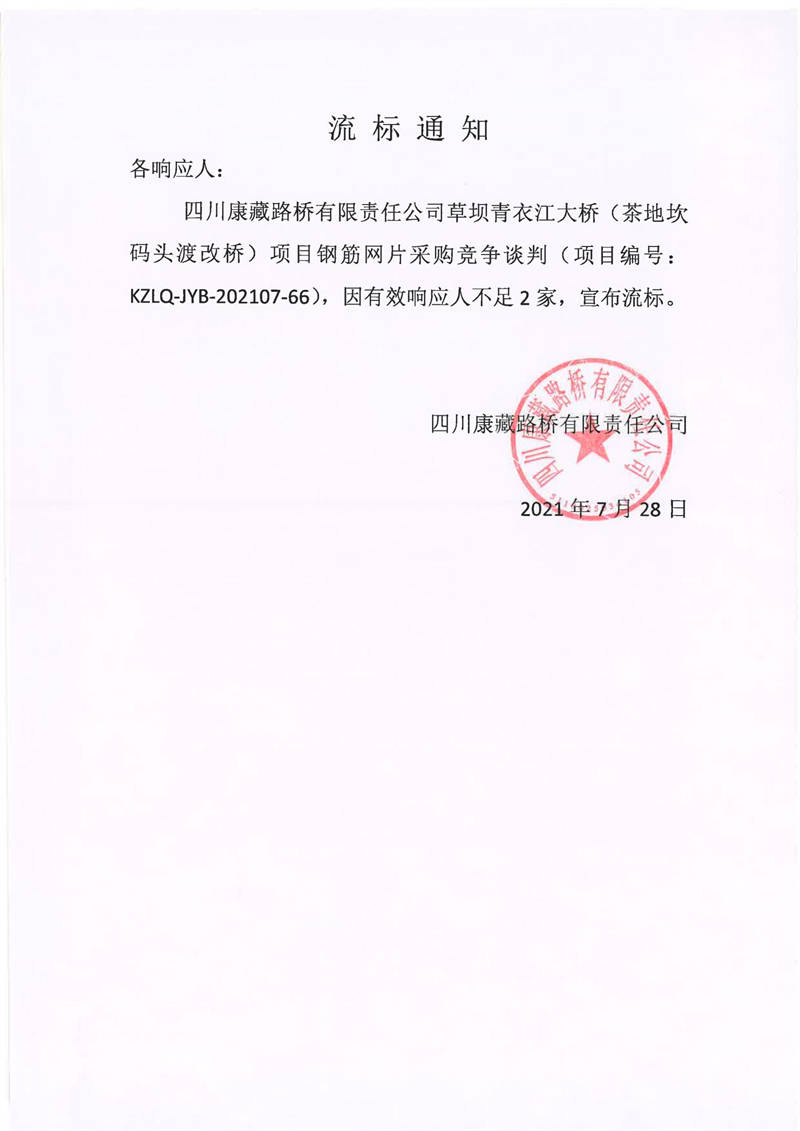四川康藏路橋有限責(zé)任公司草壩青衣江大橋(茶地坎碼頭渡改橋)項(xiàng)目鋼筋網(wǎng)片采購競爭談判流標(biāo)通知