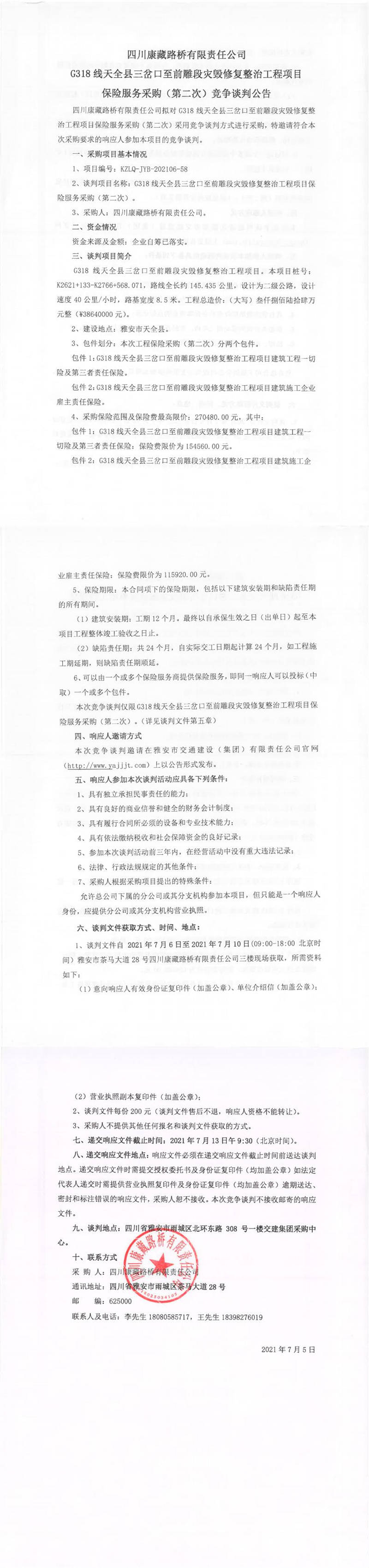 四川康藏路橋有限責任公司G318線天全縣三岔口至前雕段災毀修復整治工程項目保險服務采購(第二次)競爭談判公告