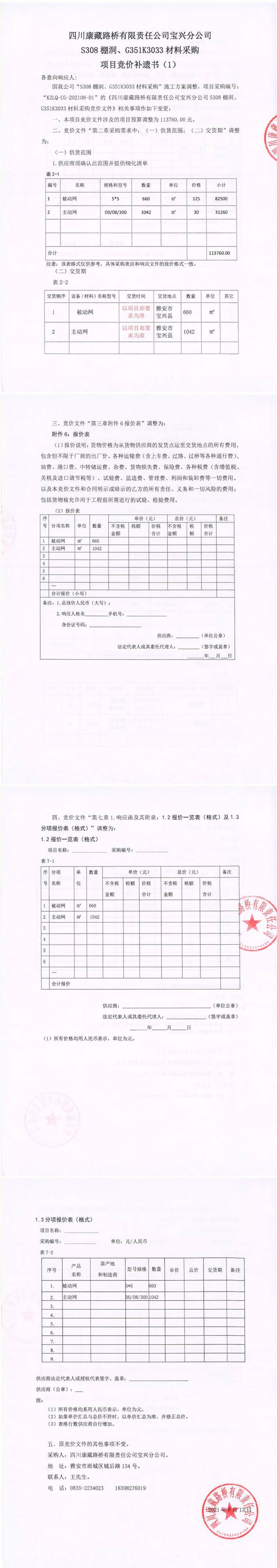 四川康藏路橋有限責(zé)任公司寶興分公司S308棚洞、G351K3033材料采購(gòu)項(xiàng)目競(jìng)價(jià)補(bǔ)遺書(shū)(1)