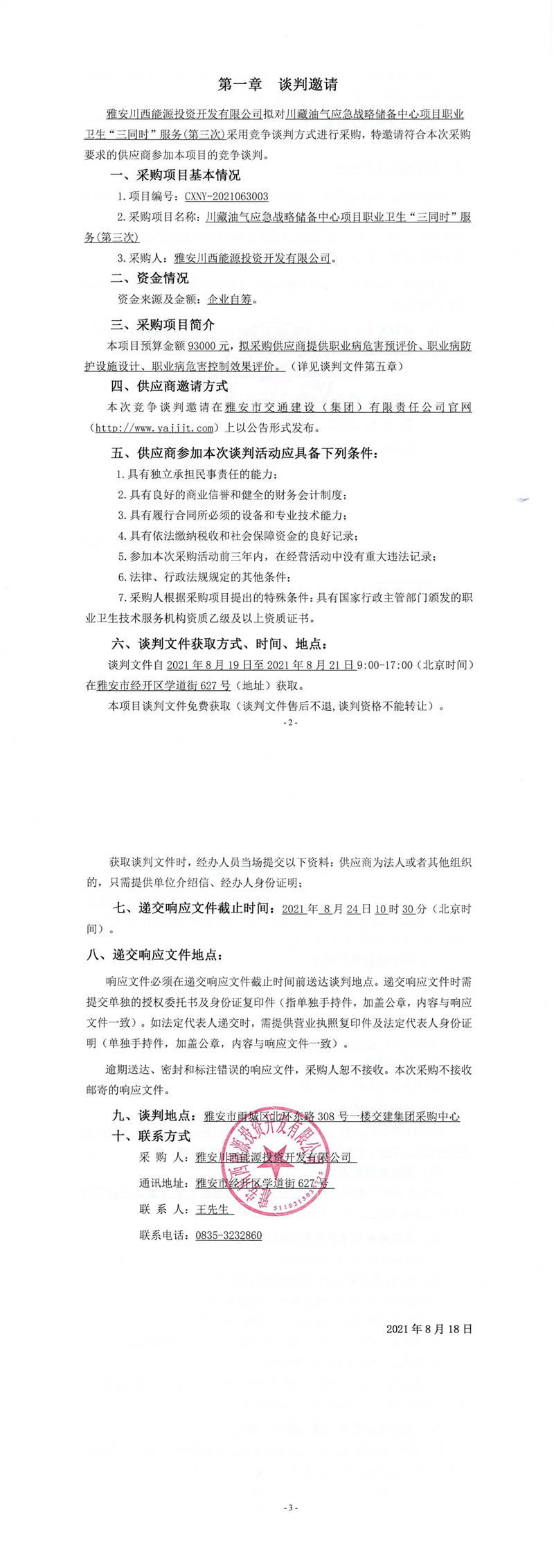 雅安川西能源投資開發(fā)有限公司川藏油氣應(yīng)急戰(zhàn)略儲(chǔ)備中心項(xiàng)目職業(yè)衛(wèi)生“三同時(shí)”服務(wù)(第三次)競爭談判