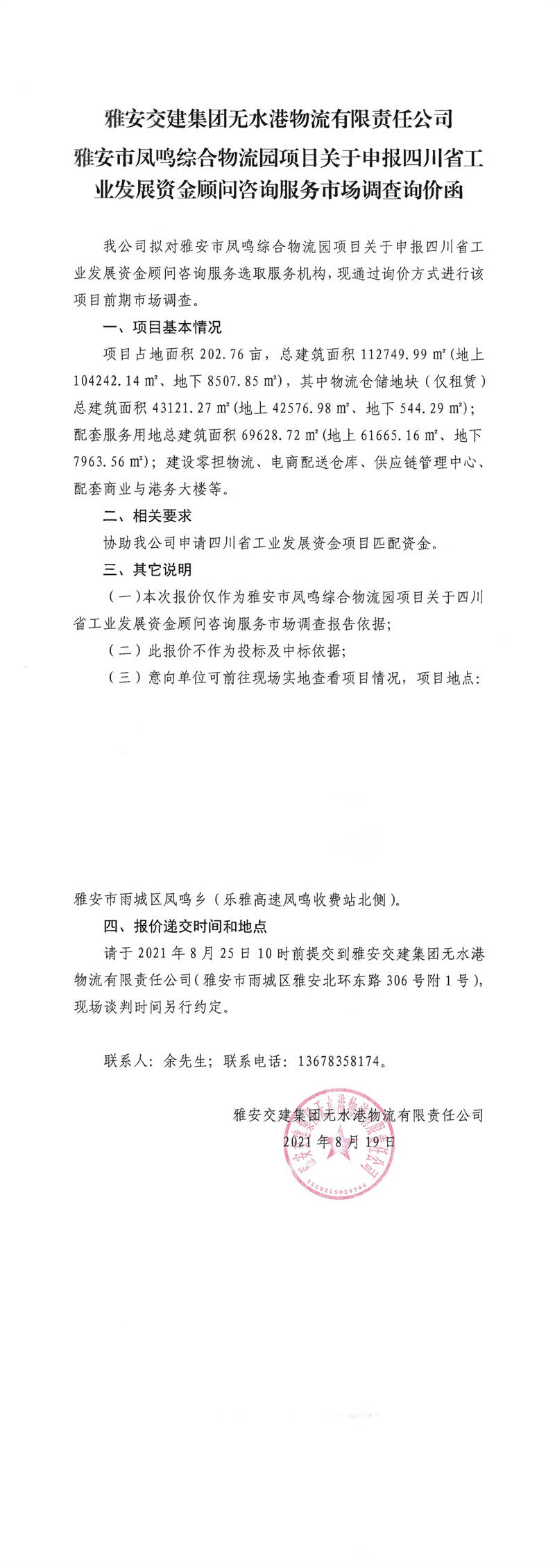 雅安交建集團無水港物流有限責任公司雅安市鳳鳴綜合物流園項目關(guān)于申報四川省工業(yè)發(fā)展資金顧問咨詢服務市場調(diào)查詢價函