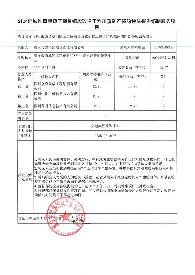 雅安交建集團(tuán)項目管理有限公司S104雨城區(qū)草壩鎮(zhèn)至望魚鎮(zhèn)段改建工程壓覆礦產(chǎn)資源評估報告編制服務(wù)項目評審結(jié)果公示