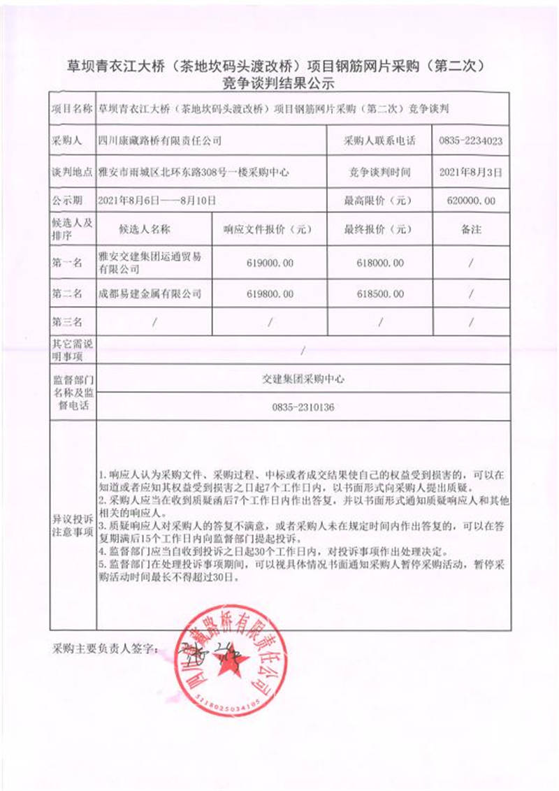 四川康藏路橋有限責(zé)任公司草壩青衣江(茶地坎碼頭渡改橋)項(xiàng)目鋼筋片采購競(jìng)爭(zhēng)談判結(jié)果公示