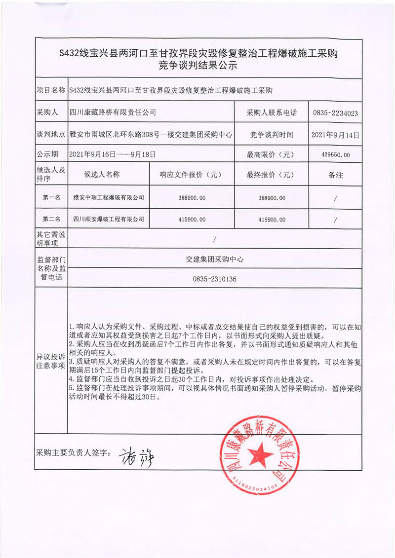 四川康藏路橋有限責(zé)任公司S432線寶興縣兩河口至甘孜界段災(zāi)毀修復(fù)整治工程爆破施工采購競爭談判結(jié)果公示