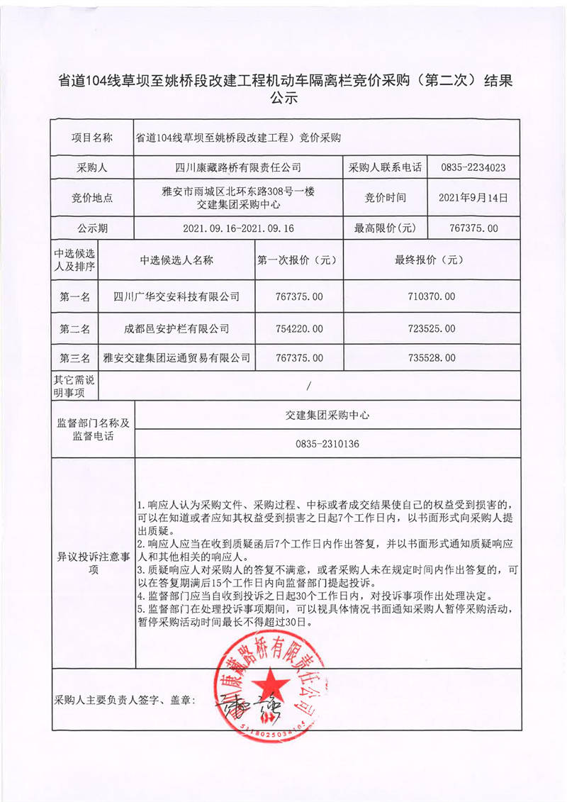四川康藏路橋有限責(zé)任公司省道104線草壩至姚橋段改建工程機動車隔離欄競價采購(第二次)結(jié)果公示