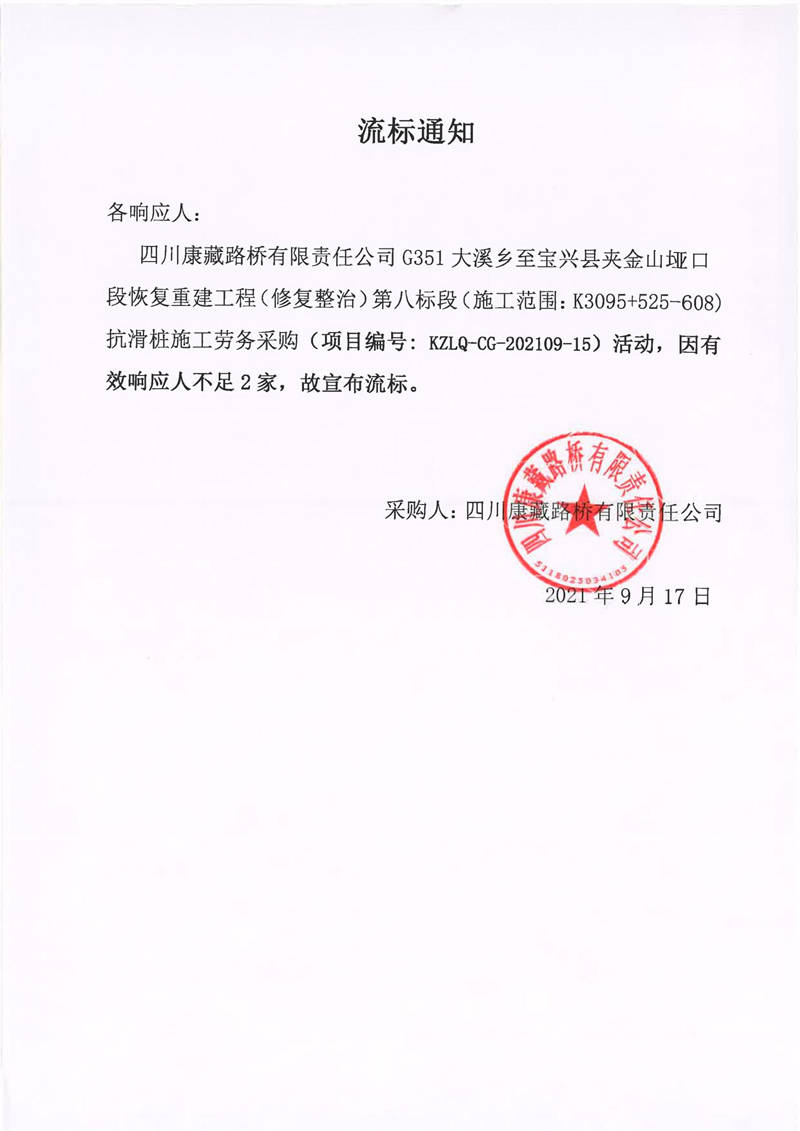 四川康藏路橋有限責任公司G351大溪鄉(xiāng)至寶興縣夾金山埡口段恢復(fù)重建工程(修復(fù)整治)第八標段(施工范圍:K3095+525-608)抗滑樁施工勞務(wù)采購流標通知