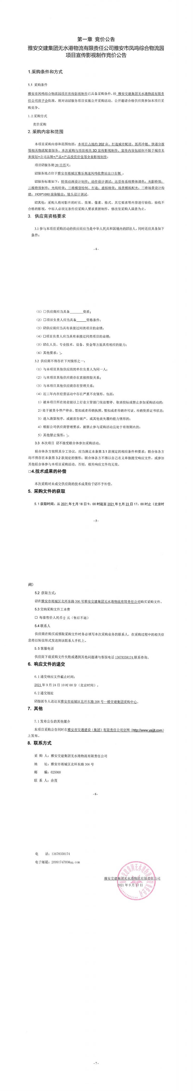 雅安交建集團無水港物流有限責(zé)任公司雅安市鳳鳴綜合物流園項目宣傳影視制作競價公告