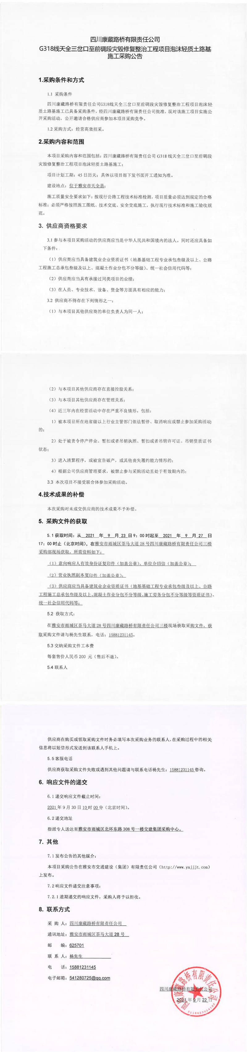 四川康藏路橋有限責(zé)任公司G318線(xiàn)天全三岔口至前碉段災(zāi)毀修復(fù)整治工程項(xiàng)目泡沫輕質(zhì)土路基施工采購(gòu)公告