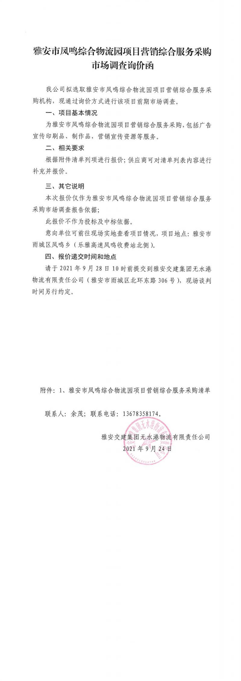 雅安交建集團(tuán)無(wú)水港物流有限責(zé)任公司雅安市鳳鳴綜合物流園項(xiàng)目營(yíng)銷綜合服務(wù)采購(gòu)市場(chǎng)調(diào)查詢價(jià)函
