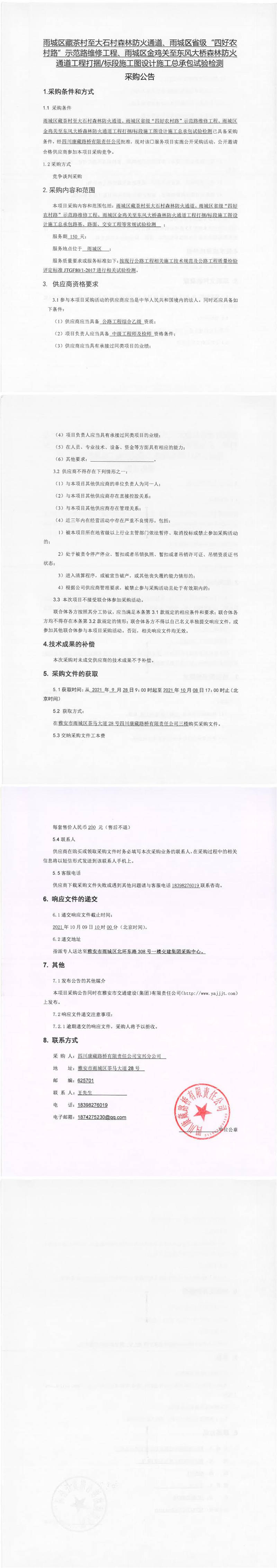 四川康藏路橋有限責任公司雨城區(qū)藏茶村至大石村森林防火通道、雨城區(qū)省級“四好農村路”示范路維修工程、雨城區(qū)金雞關至東風大橋森林防火通道工程打捆/標段施工圖設計施工總承包試驗檢測采購公告