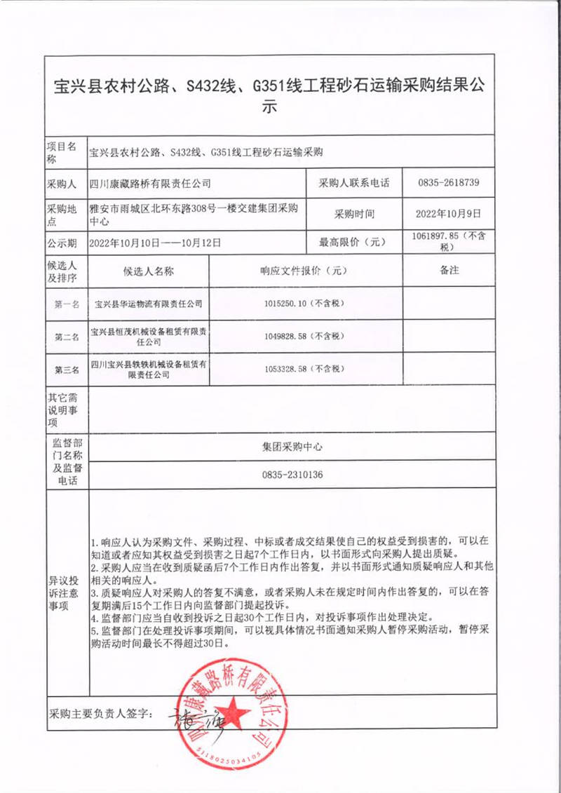 四川康藏路橋有限責(zé)任公司寶興縣農(nóng)村公路、S432線(xiàn)、G351線(xiàn)工程砂石運(yùn)輸采購(gòu)結(jié)果公示