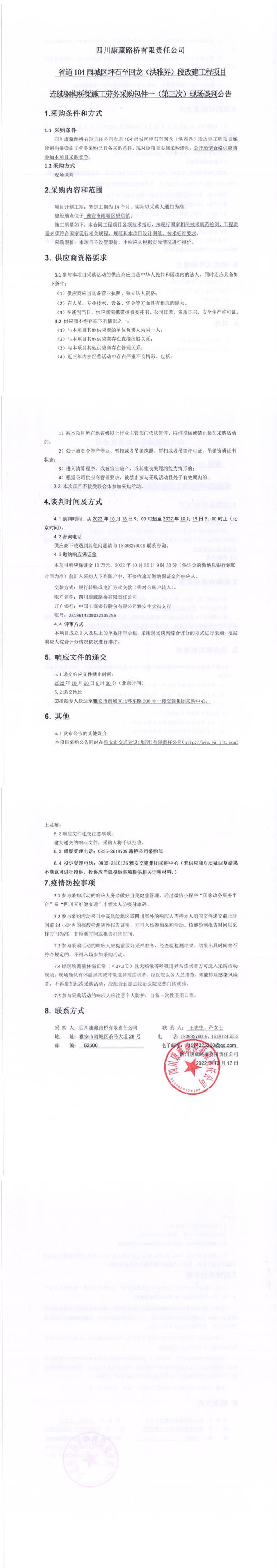 四川康藏路橋有限責任公司省道104雨城區(qū)坪石至回龍(洪雅界)段改建工程項目連續(xù)鋼構(gòu)橋梁施工勞務采購包件一(第三次)現(xiàn)場談判公告