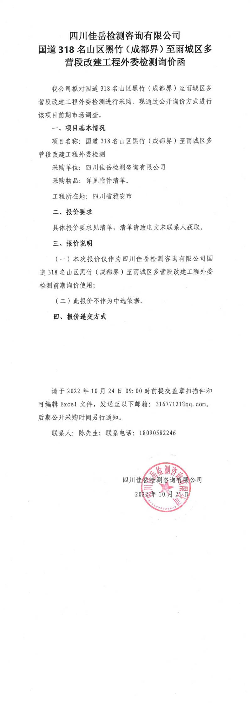 四川佳岳檢測(cè)咨詢有限公司國(guó)道318名山區(qū)黑竹(成都界)至雨城區(qū)多營(yíng)段改建工程外委檢測(cè)詢價(jià)函