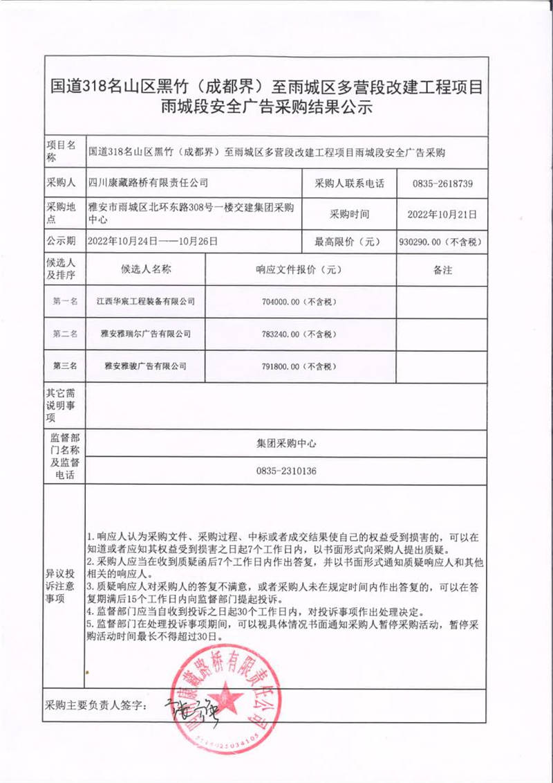 四川康藏路橋有限責任公司國道318名山區(qū)黑竹(成都界)至雨城區(qū)多營段改建工程項目雨城段安全廣告采購結果公示