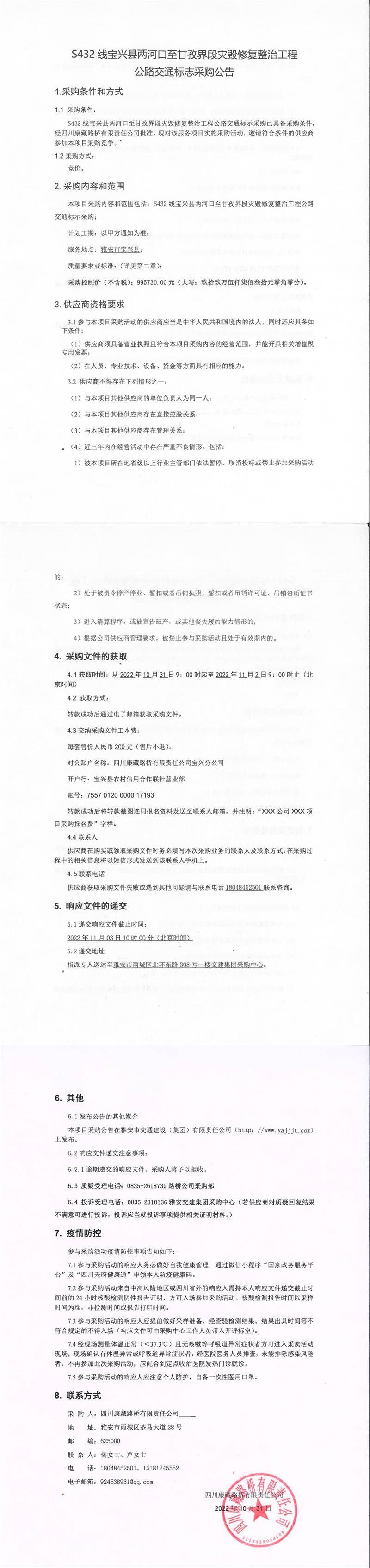 四川康藏路橋有限責(zé)任公司S432線寶興縣兩河口至甘孜界段災(zāi)毀修復(fù)整治工程公路交通標(biāo)志采購公告