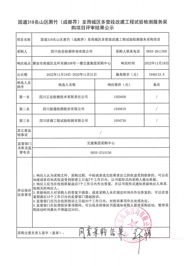 四川佳岳檢測(cè)咨詢有限公司國(guó)道318名山區(qū)黑竹(成都界)至雨城區(qū)多營(yíng)段改建工程試驗(yàn)檢測(cè)服務(wù)采購(gòu)項(xiàng)目評(píng)審結(jié)果公示