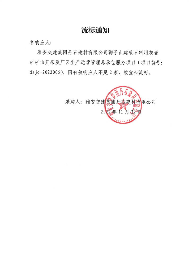 雅安交建集團丹石建材有限公司獅子山建筑石料用灰?guī)r礦礦山開采及廠區(qū)生產運營管理總承包服務項目采購流標通知