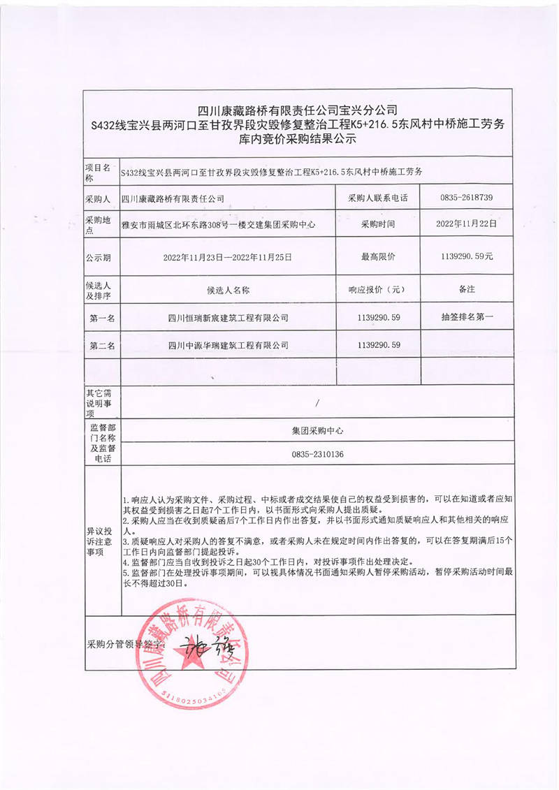 四川康藏路橋有限責任公司寶興分公司S432線寶興縣兩河口至甘孜界段災毀修復整治工程K5+216.5東風村中橋施工勞務庫內(nèi)競價采購結果公示