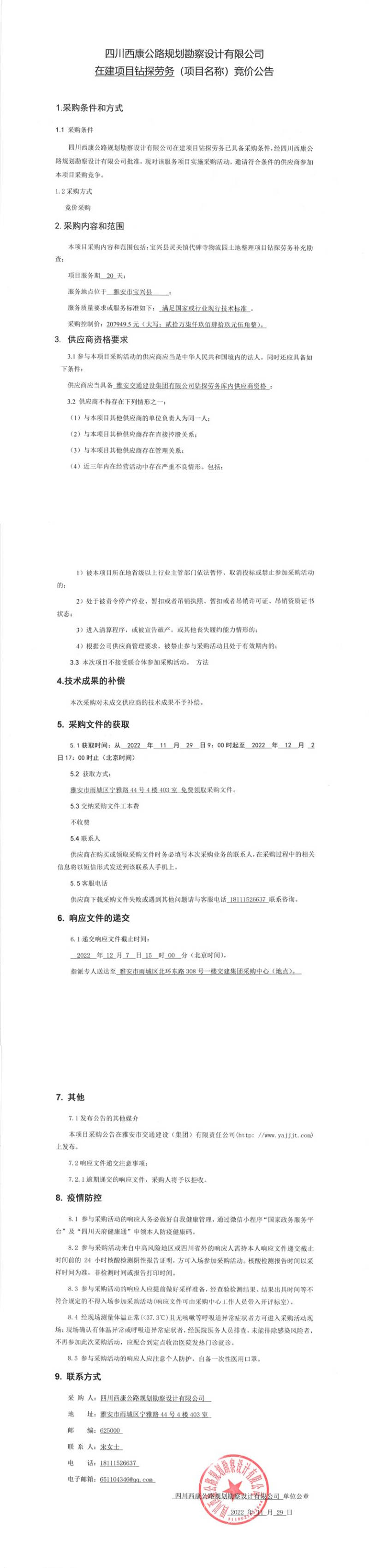 四川西康公路規(guī)劃勘察設計有限公司在建項目鉆探勞務競價公告