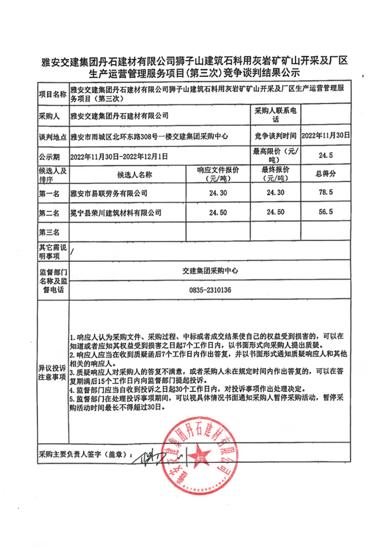 雅安交建集團(tuán)丹石建材有限公司獅子山建筑石料用灰?guī)r礦礦山開采及廠區(qū)生產(chǎn)運(yùn)營管理服務(wù)項(xiàng)目(第三次)競(jìng)爭(zhēng)談判結(jié)果公示