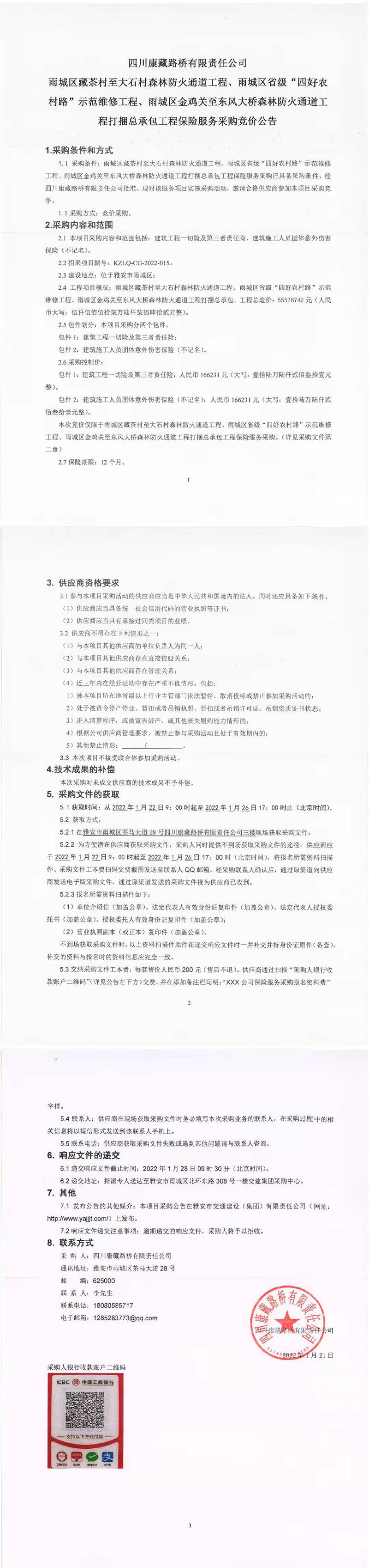 四川康藏路橋有限責任公司雨城區(qū)藏茶村至大石村森林防火通道工程、雨城區(qū)省級“四好農(nóng)村路”示范維修工程、雨城區(qū)金雞關至東風大橋森林防火通道工程打捆總承包工程保險服務采購競價公告