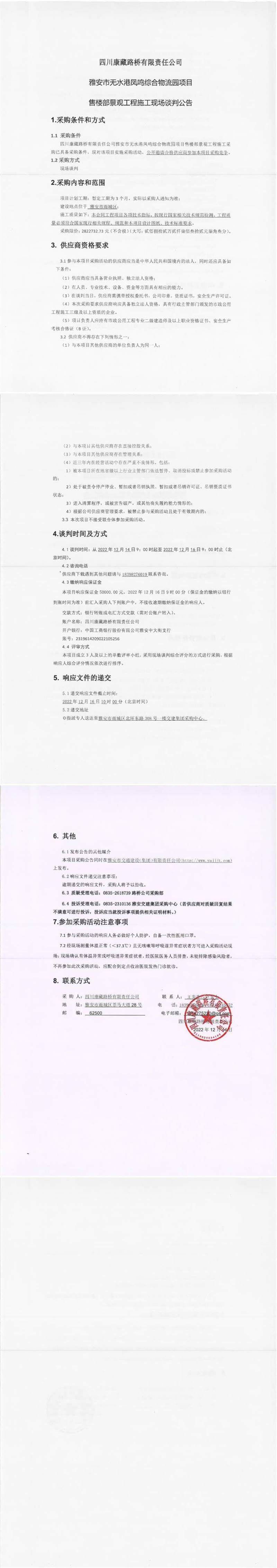 四川康藏路橋有限責(zé)任公司雅安市無水港鳳鳴綜合物流園項(xiàng)目售樓部景觀工程施工現(xiàn)場談判公告